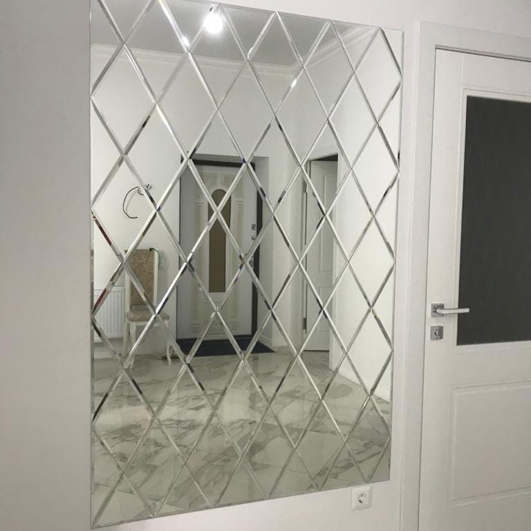 Использована серебристая квадратная зеркальная плитка размером 18х18.